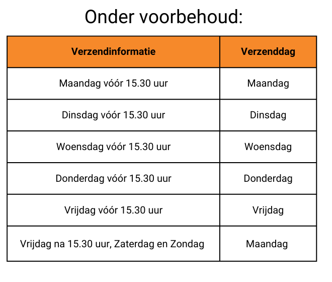 Na ontvangst van je betaling versturen wij de bestelling in de regel dezelfde werkdag, mits vóór 15.30 uur ontvangen.